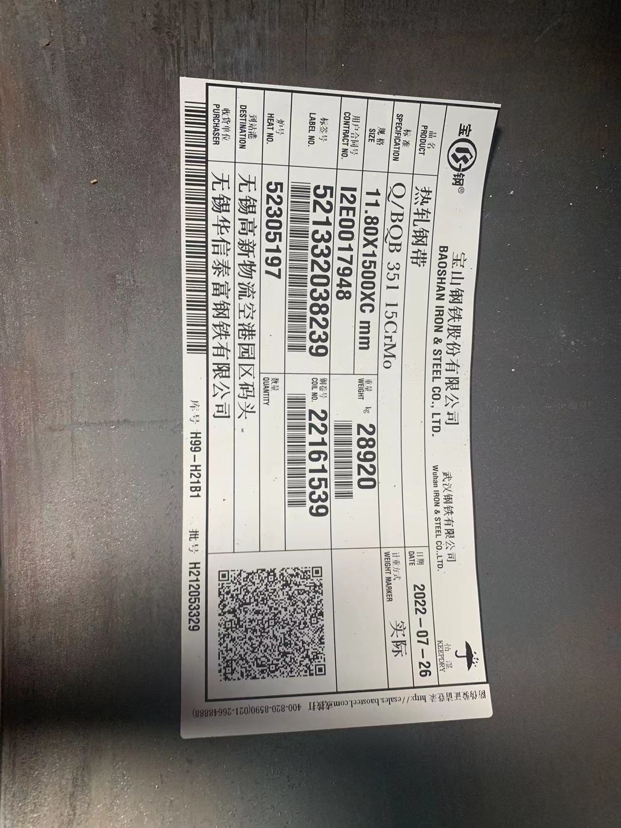 | 无锡华信泰富钢铁有限公司主营15CrMo合金板,12Cr1MoV合金板,1Cr6Si2Mo耐热钢板,15CrMo钢板,合金板主要货源地为;上海宝钢,兴澄特钢,辽宁营口。公司位于中国经济最繁荣的华东长三角工业区,美丽的太湖之滨-无锡市。公司常备合金板15CrMo钢板,12Cr1MoV钢板,SA387Gr11美标合金板,SA387Gr22钢板,耐热锅炉板有1Cr5Mo钢板,1Cr20Ni14Si2耐热不锈钢板。常备资源3-80毫米,宽度1500-2500毫米。长期合作客户可零割销售!公司室内仓库可存放5000吨现货,拥有专业的装卸团队,全天候方便快捷的为客户解决装货问题。